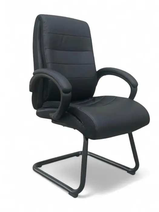 כיסא מרופד בגימור דמוי עור איכותי, עם משענת גב תומכת, ידיות מרופדות ושלדת מתכת יציבה בעיצוב מודרני.