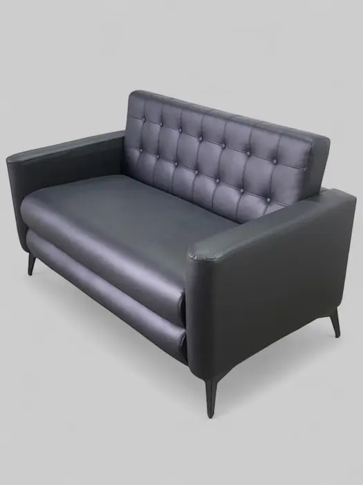 ספה תלת-מושבית מעוצבת בקווים נקיים עם ריפוד דמוי עור שחור איכותי, גימור כפתורים בגב הספה למראה קלאסי-מודרני, ורגלי מתכת יציבות בגוון תואם. המושב הרחב מעניק נוחות מרבית ועמידות לאורך זמן. מתאימה לחללים עסקיים או לסלון בקו אלגנטי ומוקפד.